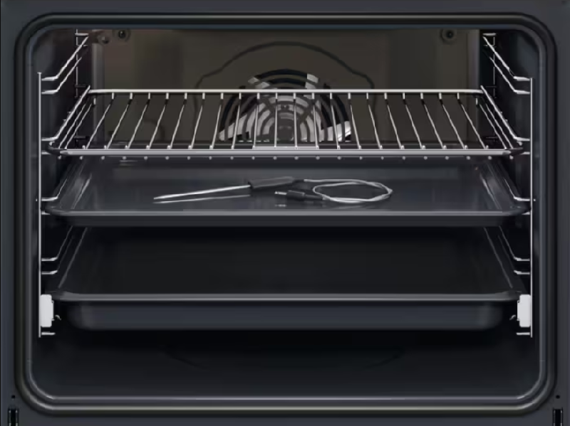 Интерьер камеры продуман для удобства и гибкости: пять уровней размещения решётки и противней дают простор для экспериментов с несколькими блюдами одновременно. В комплекте идут два противня и одна решётка, а съёмные телескопические направляющие упрощают работу с горячей посудой и повышают безопасность при вынимании блюд. Дверца откидная с технологией плавного закрытия и тройным стеклом снижает потери тепла и обеспечивает комфорт при эксплуатации, а галогенное освещение камеры делает процесс контроля за приготовлением простым и наглядным даже при закрытой дверце.