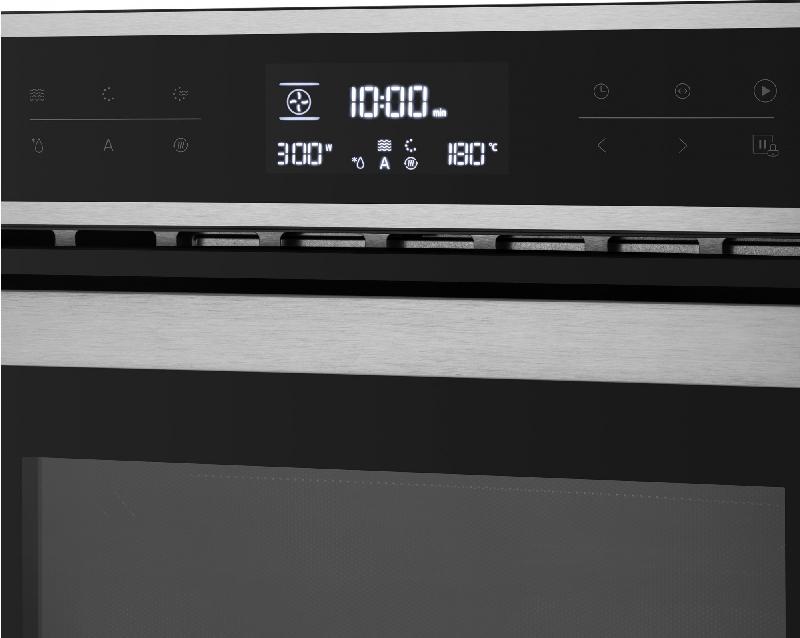 Духовка оборудована интеллектуальным сенсорным LED-дисплеем. Система управления эффективна и требует минимального вмешательства пользователя. Дисплей включает полную индикацию хода текущих программ, часы, таймер и др.