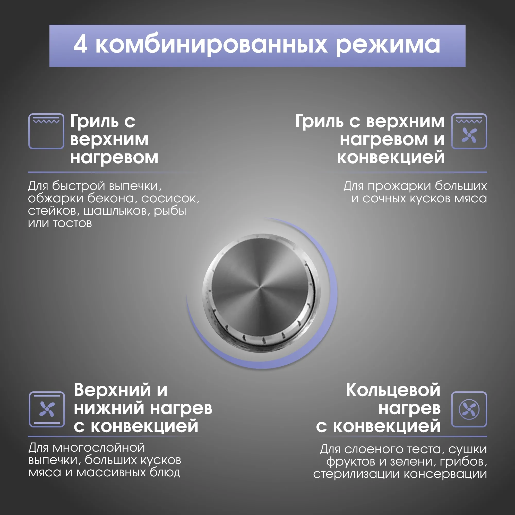 | Особенности конструкции | вентилятор охлаждения, дисплей, полностью стеклянная внутренняя поверхность дверцы духовки, телескопические направляющие, электронный программатор |