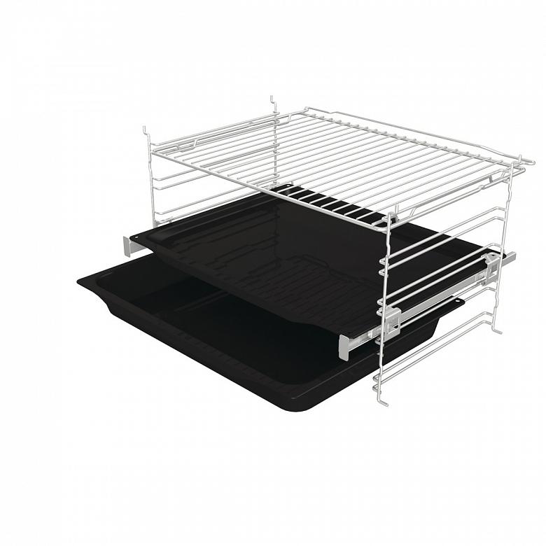 Модель оборудована телескопическими направляющими и LED-подсветкой. Потребляемая мощность равна 3500 Вт. В комплект входят противни и решетки для гриля.