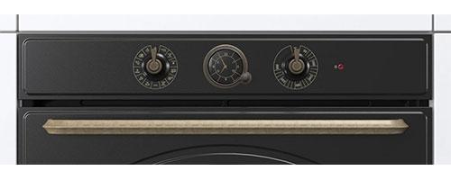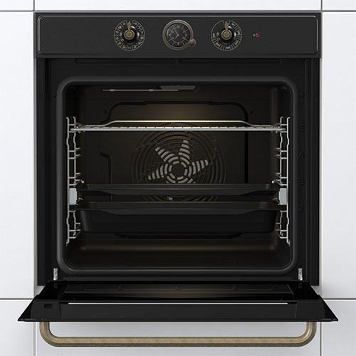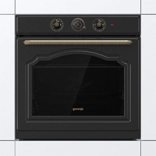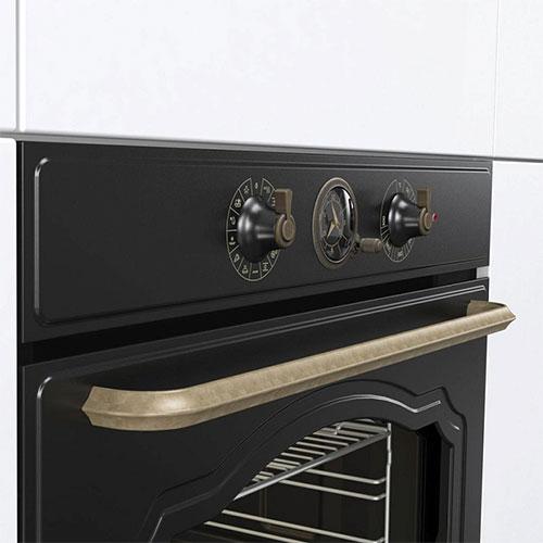 Духовой шкаф Gorenje BOS67372CLB выполнен в старинном стиле и относится к коллекции Classico. Матовый черный цвет придает ему элегантность и стиль, а бронзовая фурнитура подчеркивает выбранную стилистику. Панель управления также имеет ретро-облик и состоит из эргономичных переключателей, дополненных многофункциональным аналоговым программатором. С его помощью можно выбирать необходимые опции, а также устанавливать таймер на отключение или будильник и использовать как часы.