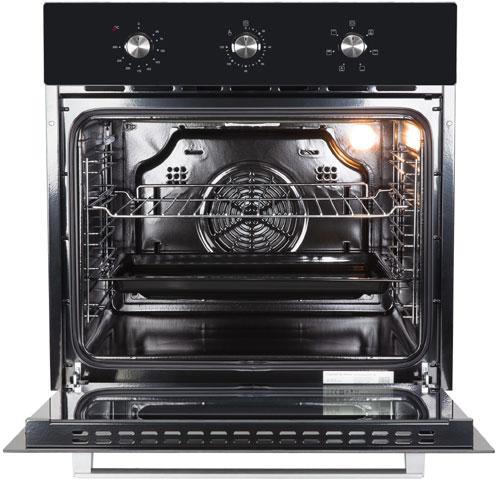 Мультифункциональная духовка шириной 60 см выполнена в чёрном цвете и оснащена утапливаемыми ручками для управления.