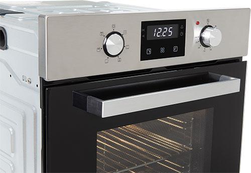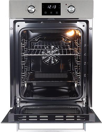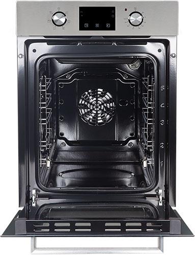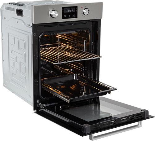 Объем камеры в 51 л с 5 уровнями установки противня на хромированных боковых направляющих позволит приготовить блюда любых размеров: запечь курицу целиком или испечь пирог на большую семью. В комплекте есть противень и съемная решетка.