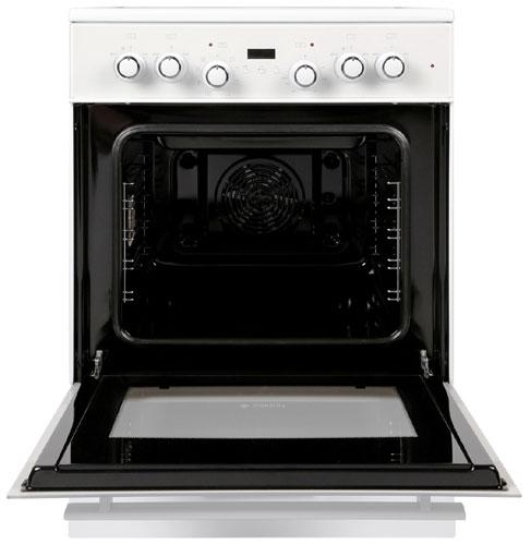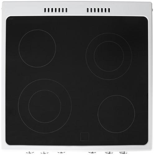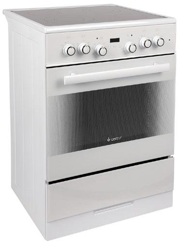 Плита электрическая. Цвет Белый.Стеклокерамическая варочная поверхность, 2 двухзонных конфорки, таймер электронный, электрогриль, конвекция, вертел с электроприводом, индикатор остаточного тепла, шашлычница,  подсветка духовки, съёмные проволочные направляющие, выдвижной ящик, регулировочные ножки. Без крышки. Полезный объем духовки - 55 литров. Преимущества: