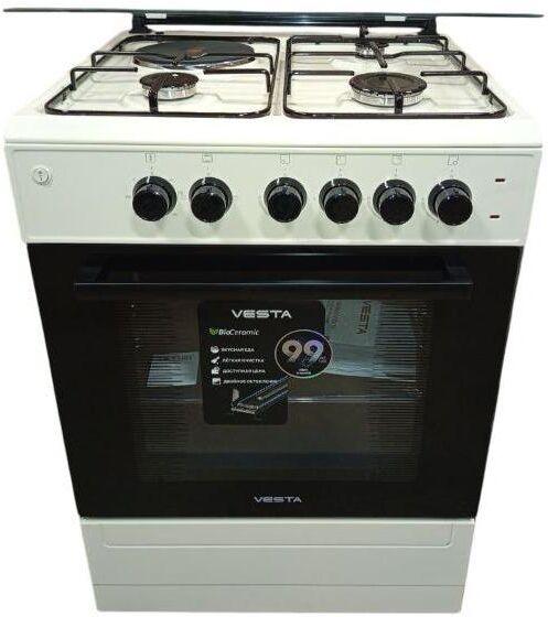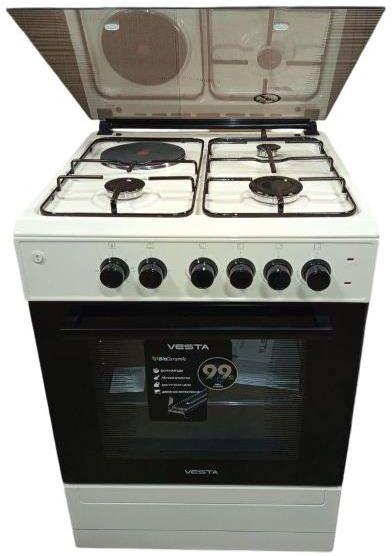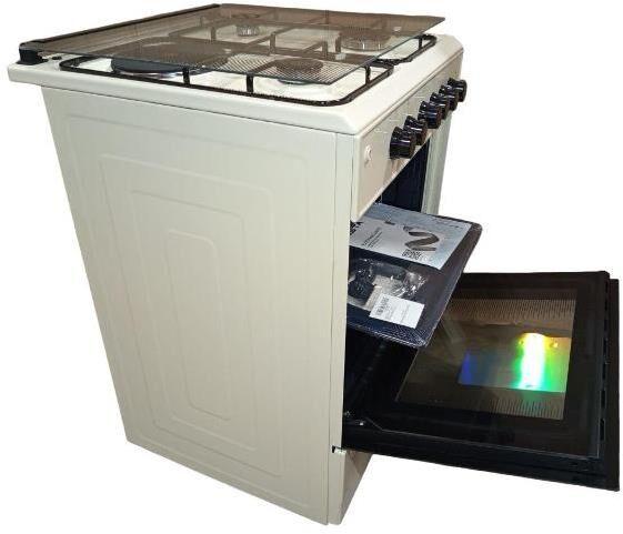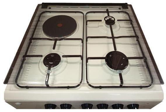 Ширина плиты, см 60, Глубина плиты, см 60, Объем духовки, л 65, Высота, см 85, Горелки стола: Газовые – 3 шт. Электр.–1 шт. Мощность горелок рабочего стола: -Горелка передняя левая/правая – 2,0/2,4 кВт. Горелка задняя левая, электрическая – 1,5 кВт. Горелка задняя правая – 1,0 кВт. Решетка рабочего стола – сталь. Крышка рабочего стола – стекло. Верхний нагреватель духовки – ТЭН. Нижний нагреватель духовки – ТЭН. Электророзжиг при помощи кнопки. Электрическая подсветка духовки. Термостат, Индикатор работы электроконфорок. Индикатор работы ТЭНа духовки. Противень – 2 шт.