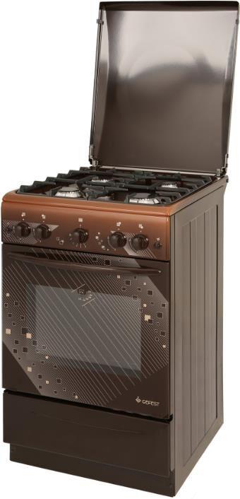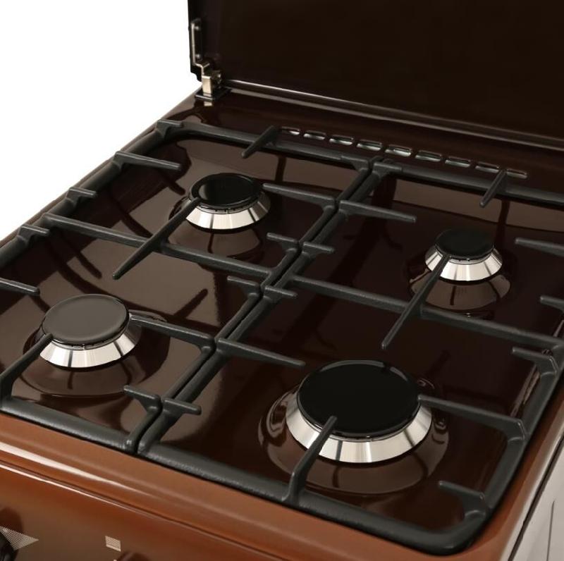 С января 2026 года вводится обновлённый дизайн панели; Габаритные размеры: 50х58.5х85 см. Полезный объем духовки: 52 л. Тип очистки Гидролизная/ 4 газ. конфорки. Цвет модели Коричневый. Материал варочной поверхности Эмаль. Материал решеток варочной поверхности Чугун. Крышка плиты Металлическая. Газ-контроль духового шкафа. Электророзжиг горелок стола Кнопка розжига на панели. Тип направляющих духового шкафа Штампованные. Внутреннее покрытие духового шкафа Эмаль легкой очистки SMART CERAMIC. Количество стекол в дверце духового шкафа 2. Ящик для посуды и принадлежностей Откидная крышка. Аксессуары: Жаровня 1, Регулировочные ножки, Комплект сменных сопел, Противень 1, Решетка варочной поверхности 2, Решетка духового шкафа 1.