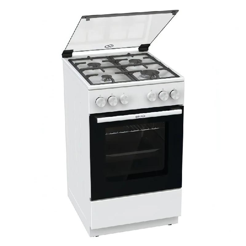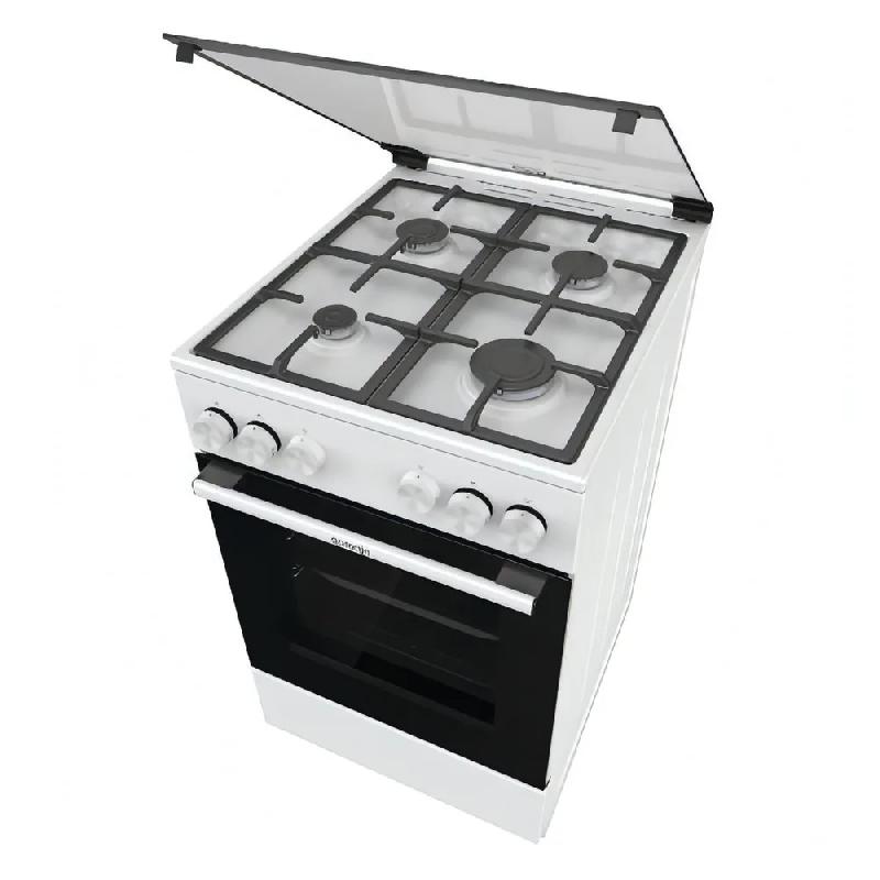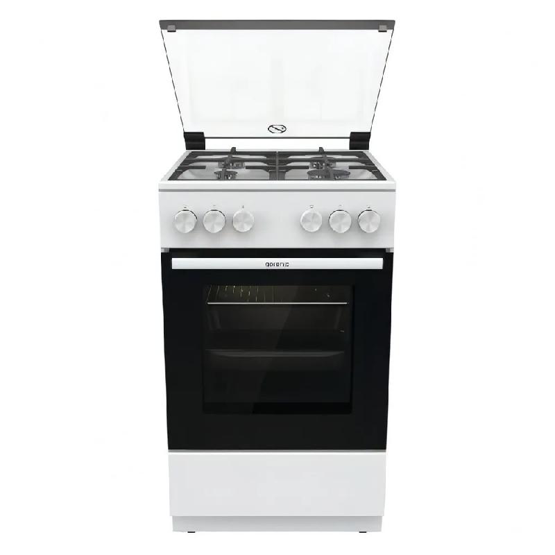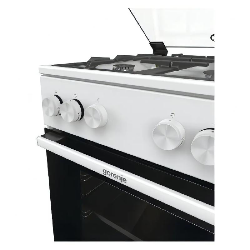 Газовая плита Gorenje GG5A11WF в белом эмалированном корпусе шириной 50 см оборудована духовым шкафом объемом 75 л с дверцей из двухслойного стекла с термоизолирующим слоем. Снаружи поверхность остается холодной. За управление отвечают поворотные механические регуляторы.