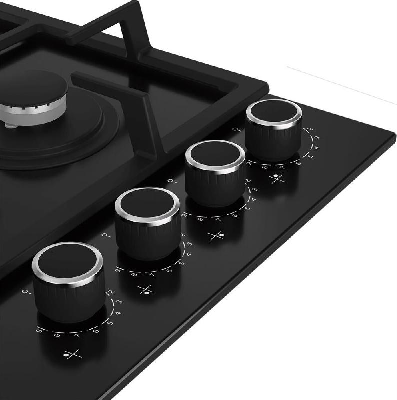 Газовая варочная поверхность (газ на стекле) 4 зоны, Step Flame, одна зона с двойным уровнем пламени, автоподжиг, газ-контроль, чугунные решетки, цвет: черный.Номинальная мощность, Вт 9500