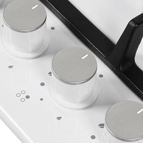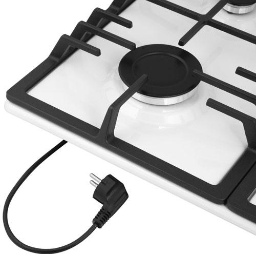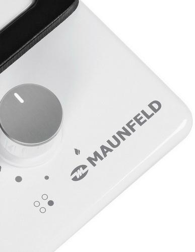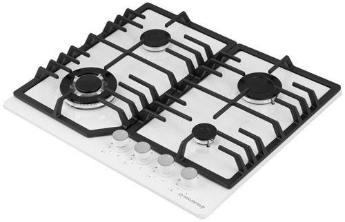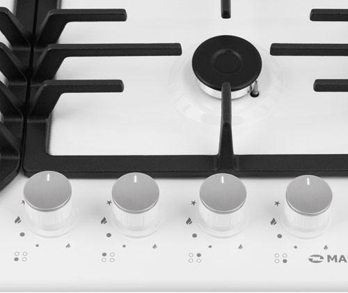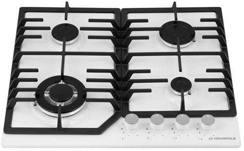 Белая независимая встраиваемая газовая панель Maunfeld EGHE.64.43CW/G весит 10,6 кг. Четыре конфорки разной мощности — от 1 до 3,8 кВт. Для осуществления безопасности есть газконтроль и аварийное отключение. Есть функция «Минимальный огонь». Регуляторы конфорок выполнены в цвете нержавеющей стали. Управление механическое.