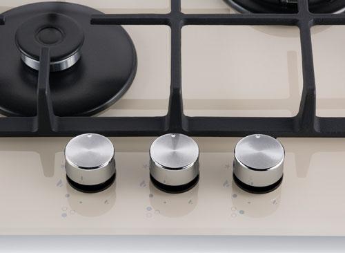 | Особенности | Регулирование подачи газа и электроподжиг конфорок происходит с помощью поворотных цельнометаллических ручек. |