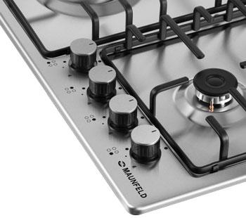 Независимая встраиваемая газовая панель Maunfeld EGHS.64.3STS-ES/G с закругленными краями устанавливается в уровень со столешницей, толщина которой не менее 40 мм. Размеры ниши — 560х485 мм. Четыре конфорки расположены на варочной поверхности, сделанной из нержавеющей стали. Решетка входит в комплект вместе с жиклерами и штуцерами, которые понадобятся, если нужно будет подключить устройство к газовому баллону. Система управления — механическая, в поворотные ручки интегрирован автоматический электроподжиг.