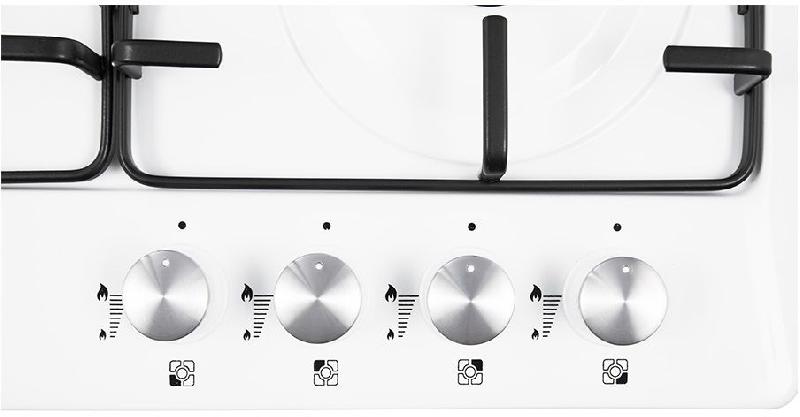 Мощность каждой горелки регулируется металлическими поворотными переключателями с встроенным электророзжигом. Это позволяет легко включить нужную конфорку одним нажатием, без спичек.