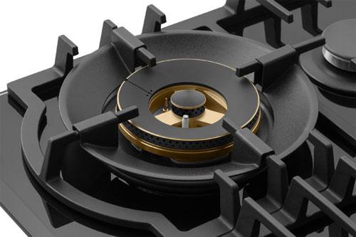 Конфорка Brass Burner оснащенная латунным колпачком конфорки и латунным пламегасителем, окрашенными в черный цвет, дополненная круглым матово-черной вставкой для сбора капель, и обладающая повышенной мощностью - это действительно новое слово в эффективности и качестве работы газовых варочных панелей!