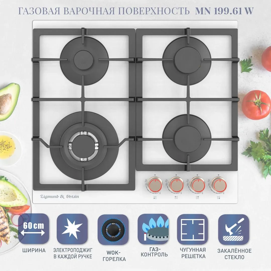 Газовая варочная поверхность Zigmund & Shtain Hi-tech MN 199.61 W стекло белое