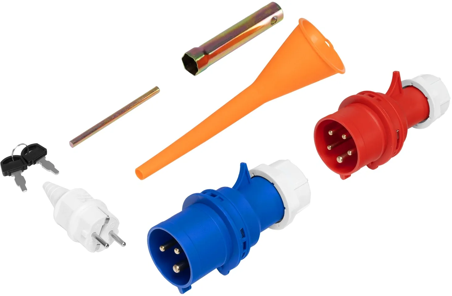 | Комплектация | Генератор, ключ свечной, ключ зажигания - 2 шт., вилка 230В/16А, вилка 230В/32А, вилка 400В/16А, руководство по эксплуатации, гарантийный талон. |