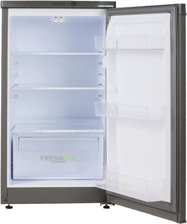 Узкий однокамерный холодильник без морозильного отделения. • цвет Матовый графит • LED освещение • механическое управление • габариты 87x48x60,5см • объем 115/115/л Количество компрессоров 1, Суточный расход электроэнергии, при температуре окружающего воздуха 24°C, кВтч 0.47, Климатический класс N, Возможность перевешивания двери, Класс энергоэффективности A