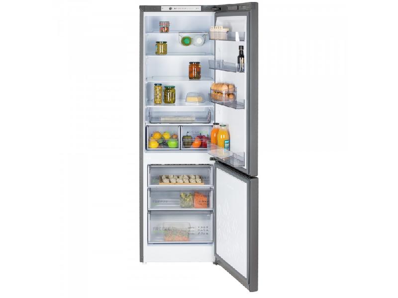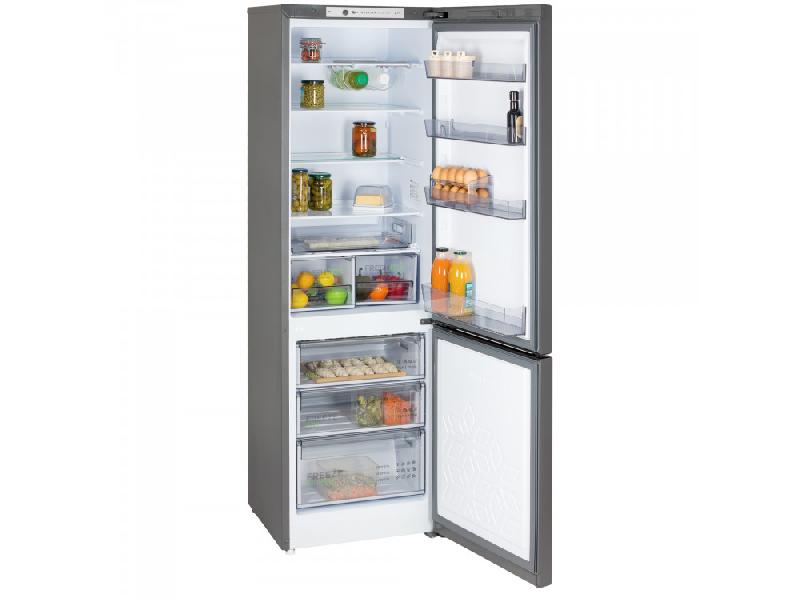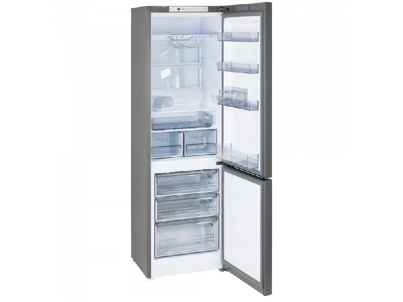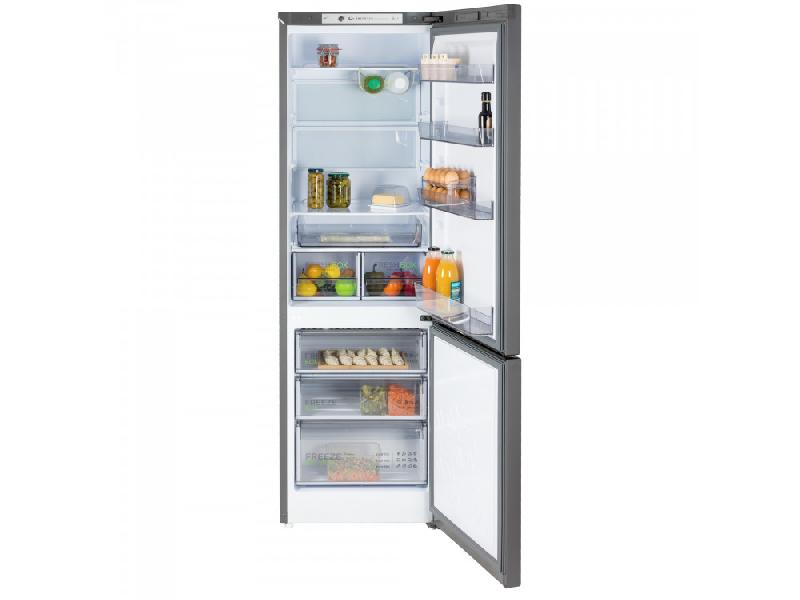 Двухкамерный холодильник с инверторным компрессором и стильным матовым графитовым корпусом. Оснащен капельной системой оттаивания, горизонтальным LED-освещением и функцией регулировки влажности Humidity control. Внутри холодильной камеры есть полка для бутылок, две складные полки и выдвижной лоток. Управление механическое. Общий объем холодильника составляет 345 литров: 245 литров — холодильная камера, 100 литров — морозильная.