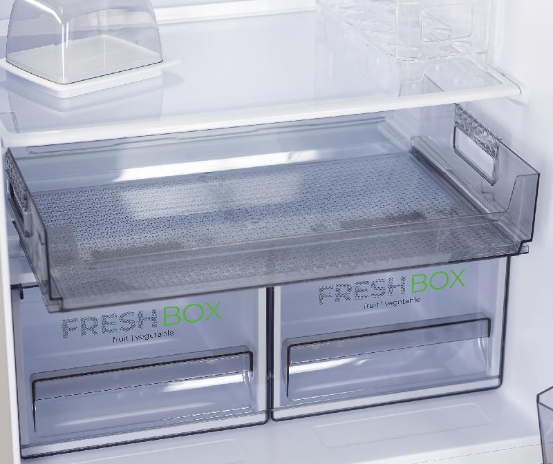 Комплектация Контейнер для 20 яиц, 2 складные полки, выдвижной лоток, полка для бутылок, масленка