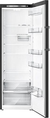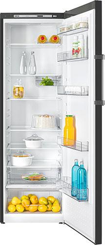Холодильник выполнен в цвете черный металлик с наружной вертикальной ручкой-скобой серебристого цвета, которая подчеркивает эксклюзивный дизайн модели. В камере расположено 5 полок из закаленного стекла. На двери холодильника установлено 5 емкостей из ударопрочного пластика, в том числе емкость нижняя с ограничителем для бутылок и емкость верхняя без крышки.