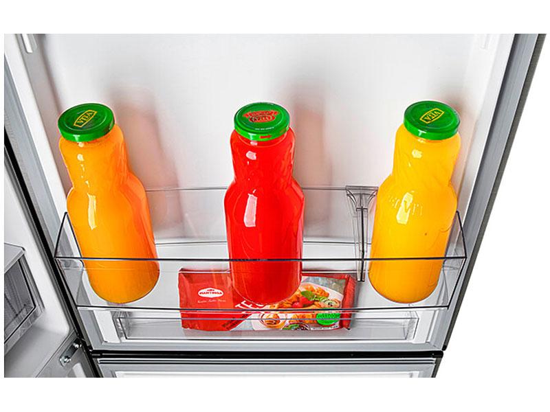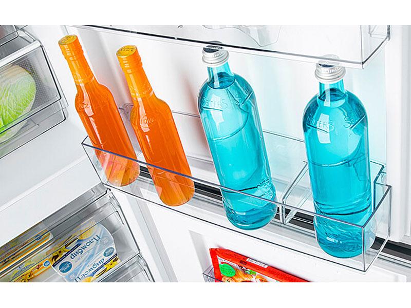 Ограничитель в нижней емкости двери плотно прижимает высокие бутылки или другие емкости