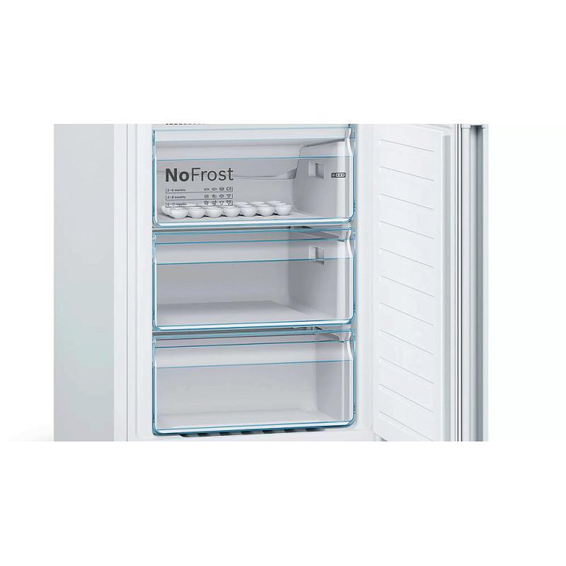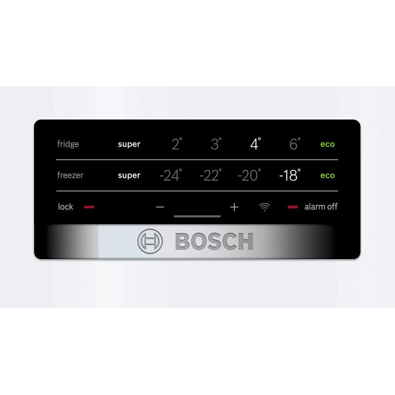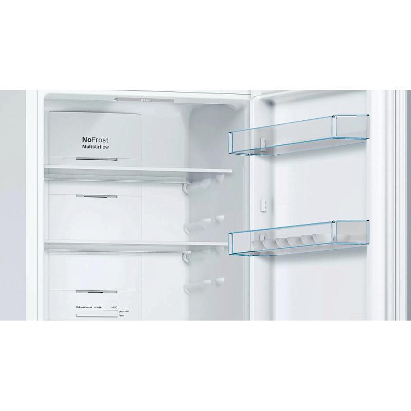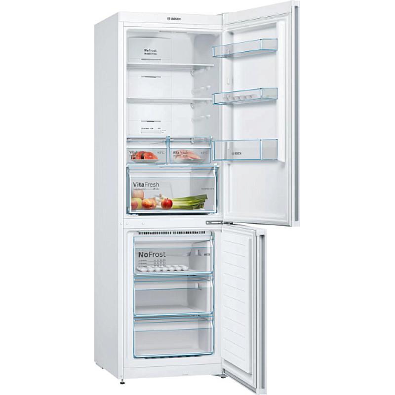 Холодильник с нижней морозильной камерой Bosch KGN39XW30U имеет полезный объем холодильной камеры - 279 литров и морозильной - 87 литров. Равномерное распределение охлажденного воздуха гарантирует система MultiAirflow. Дистанционно задавать рабочие температуры и режимы можно через мобильное приложение Home Connect. Три зоны свежести VitaFresh: 2 бокса с температурным режимом около 0℃ и одна зона с волнистым дном и естественным уровнем влажности.
