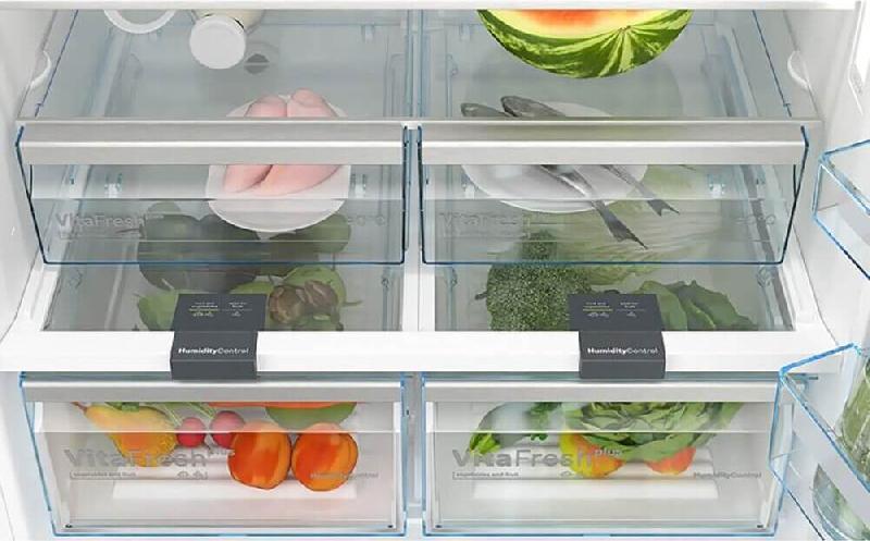 Система MultiAirflow обеспечивает равномерное распределение холодного воздуха по всему объему холодильника. В холодильнике предусмотрено несколько полок из высокопрочного стекла, включая выдвижные полки EasyAccess для удобного доступа к продуктам. Зона свежести VitaFresh plus позволяет сохранять продукты свежими в течение длительного времени. Морозильная камера оснащена двумя ящиками, включая большой ящик BigBox для замораживания крупногабаритных продуктов. Система NoFrost и автоматическая система размораживания обеспечивают удобство использования морозильной камеры. Холодильник обладает классом энергопотребления E (старое обозначение A++), что говорит о его высокой энергоэффективности. Уровень шума составляет всего 40 дБ, что позволяет установить холодильник даже в спальной комнате.