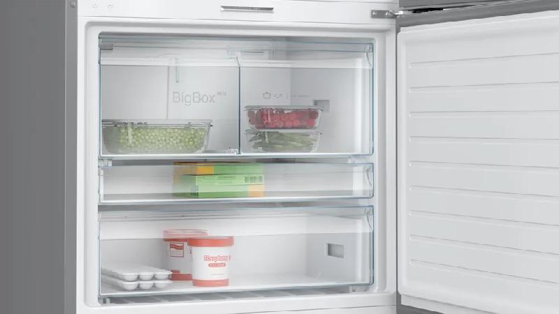 В холодильной камере установлены три полки, две из которых регулируемые, а одна - фиксированная. Такое решение позволяет максимально эффективно использовать пространство внутри холодильника. Кроме того, в холодильнике есть полка для бутылок и шесть полок на дверце, что обеспечивает дополнительное пространство для хранения продуктов. Морозильная камера расположена снизу и оснащена системой охлаждения No Frost. Это позволяет сократить время размораживания и увеличить срок службы устройства. В морозильной камере установлены три ящика, включая большой ящик BigBox, который идеально подходит для хранения крупных продуктов.