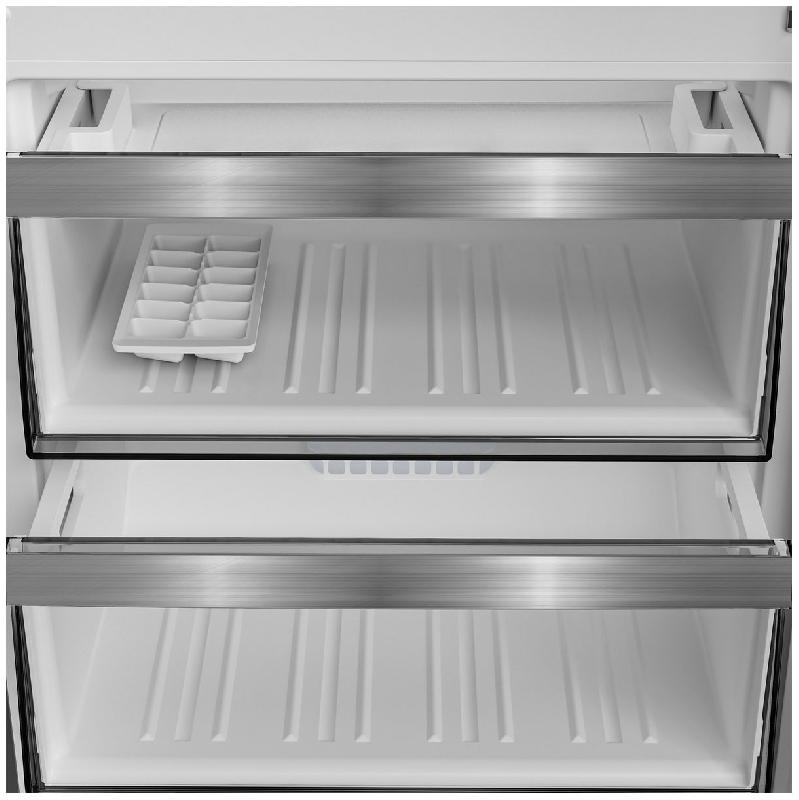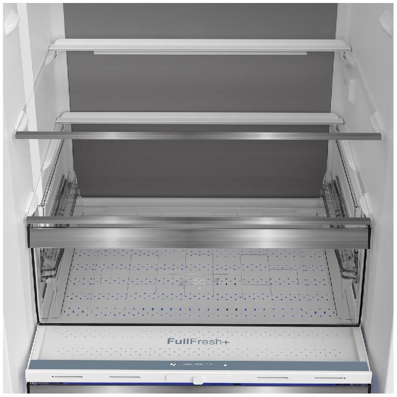 Для хранения продуктов предусмотрены полки из закаленного стекла и выдвижные ящики из пластика. Есть сухая зона сохранения свежести VitaminZone с ящиком, который движется с помощью телескопических направляющих.