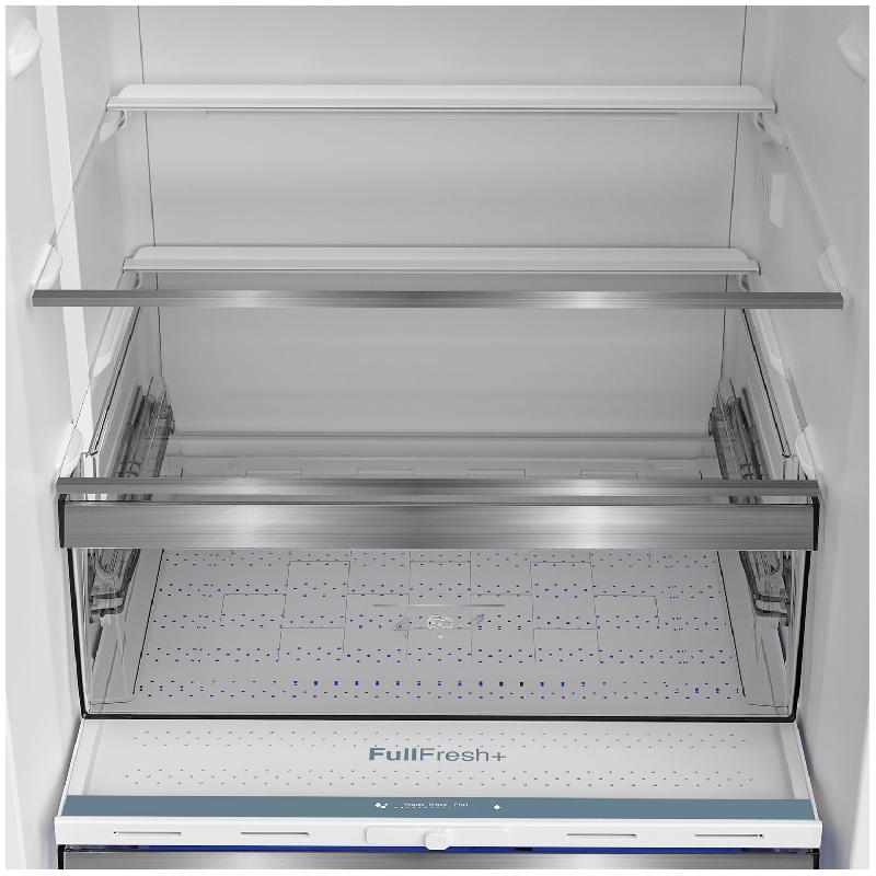 Для хранения продуктов предусмотрены полки из закаленного стекла и выдвижные ящики из пластика. Есть сухая зона сохранения свежести VitaminZone с ящиком, который движется с помощью телескопических направляющих.