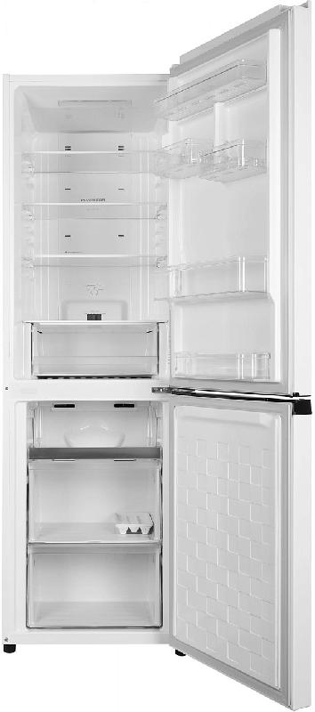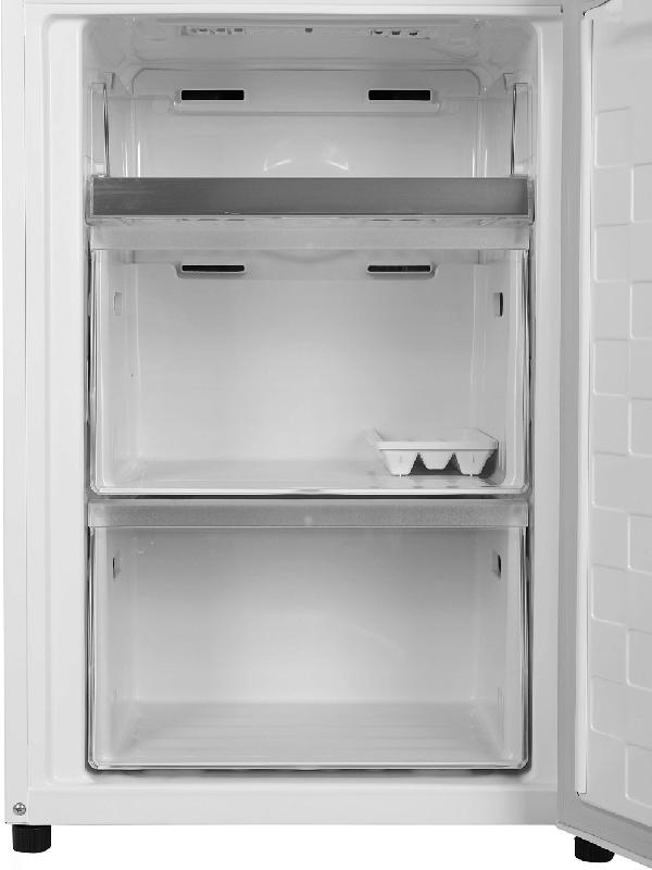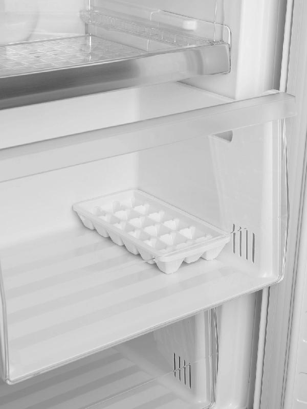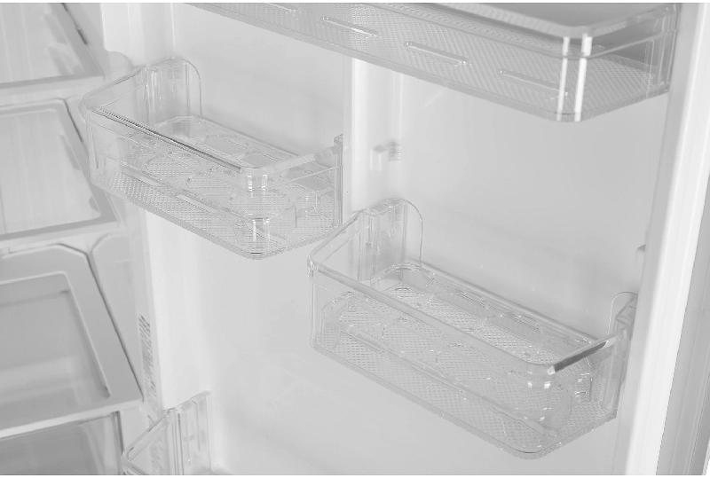 Две дверцы устройства открываются на правую сторону, что обеспечивает удобство использования. Внутри расположены 4 полки из закаленного стекла, 2 из которых можно регулировать по высоте. Также в холодильнике есть 5 полок на дверце и 1 ящик для овощей.
