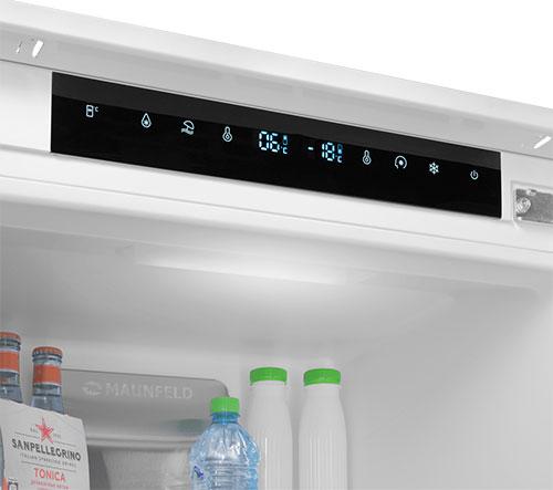 Встраиваемый холодильник MAUNFELD MBF19354NFWGR LUX Inverter имеет встроенную панель управления, оснащенная увеличенным дисплеем с индикацией температуры, и если она поднимется в любом из отделений, он подаст сигнал — как световой, так и акустический. То же самое произойдет, если вы забудете закрыть дверцу. Все это снижает вероятность порчи продуктов вследствие невнимательности или перебоев электроэнергии.
