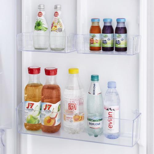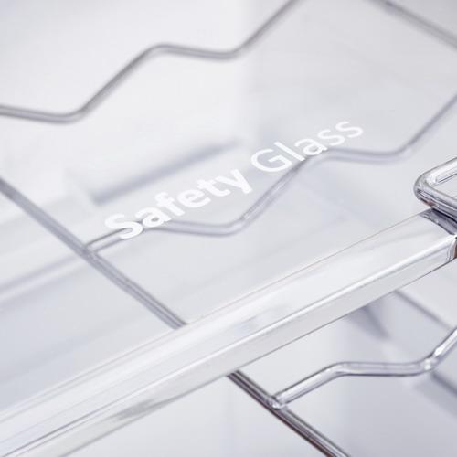 Полки из прозрачного закалённого стекла легко переставляются и не мешают равномерному освещению внутри холодильника