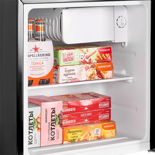 Холодильник имеет механическое управление с семью уровнями охлаждения. Встроено небольшое морозильное отделение с дверцей.