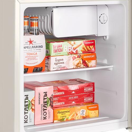 Холодильник имеет механическое управление с семью уровнями охлаждения. Встроено небольшое морозильное отделение с дверцей.