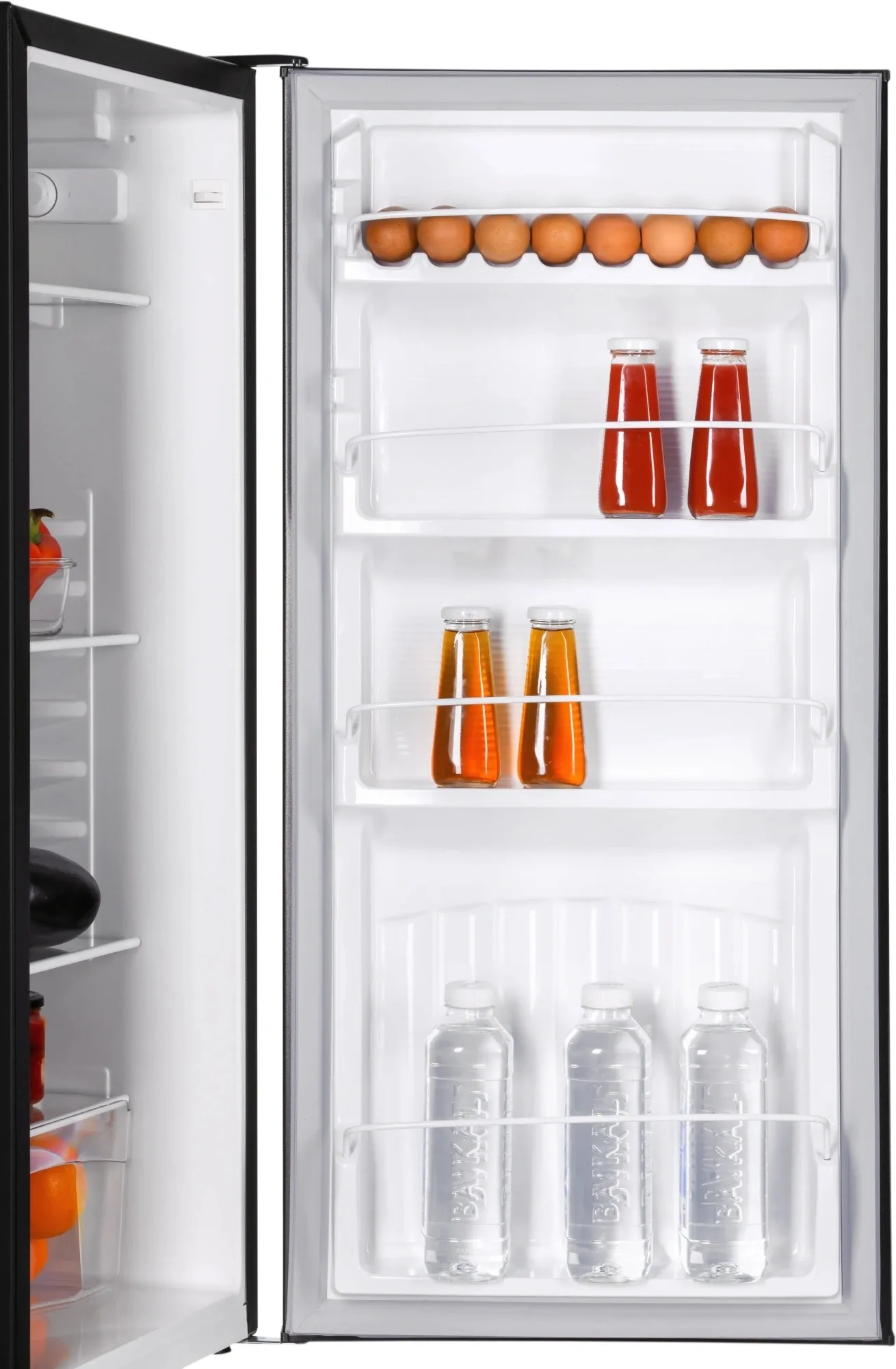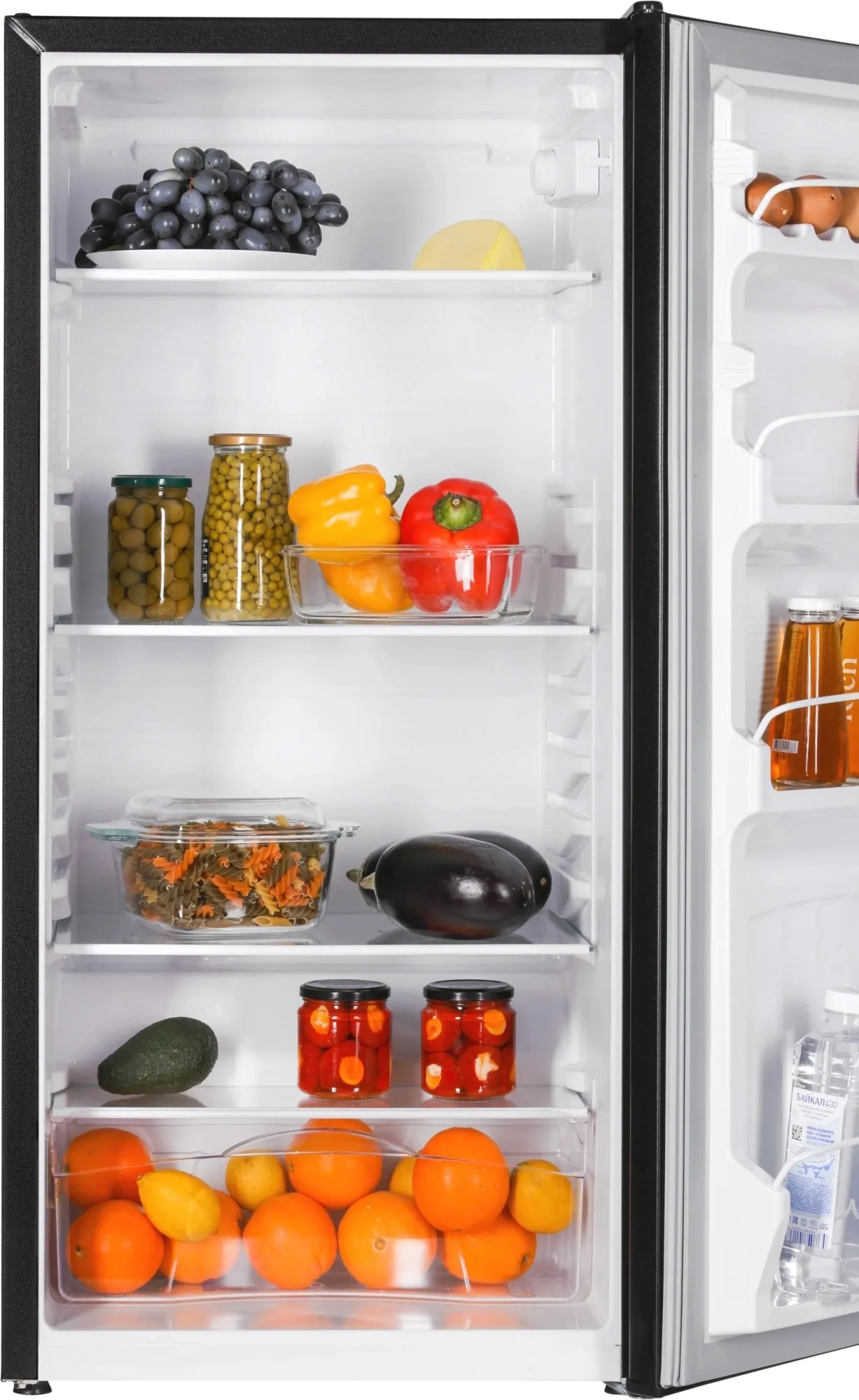 В холодильнике предусмотрены 4 полки из закаленного стекла, ящик для хранения овощей и фруктов. Небольшие полки на дверце холодильника подойдут для размещения бутылок, соусов, яиц и герметичных упаковок с сырами, йогуртами.