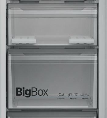 - Для повышенного комфорта и удобства загрузки крупных продуктов и больших упаковок с полуфабрикатами создан специальный ящик Big Box увеличенного объема и усиленной конструкции. Big Box - настоящий хит и оправданная необходимость для большой морозильной камеры!
