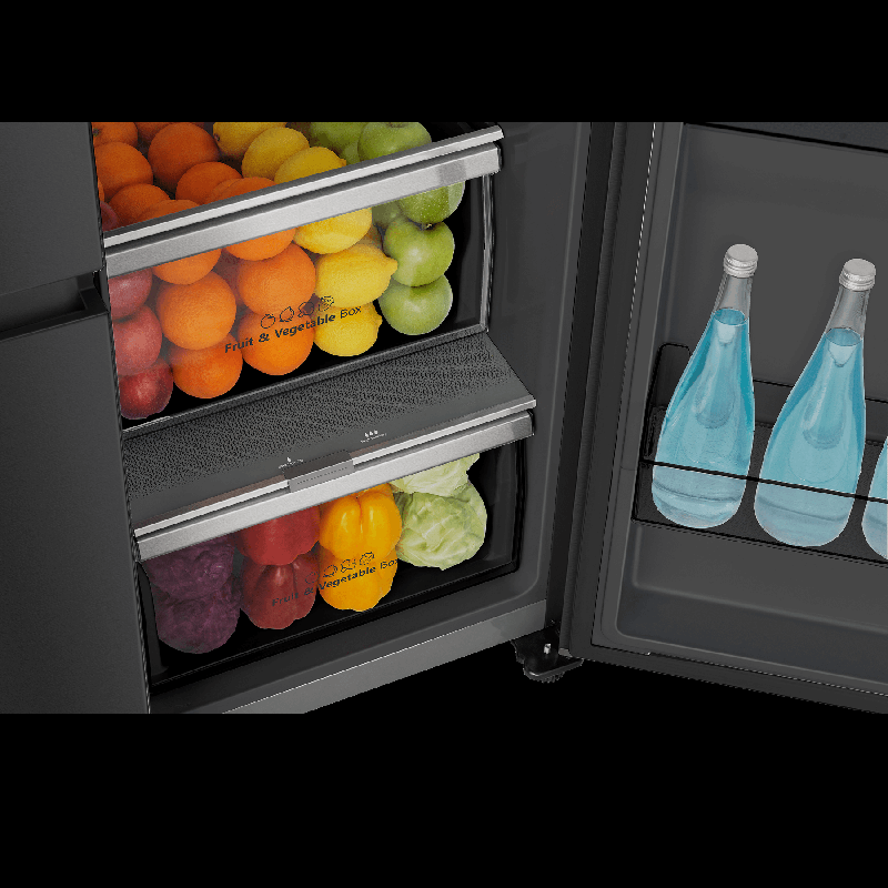 В холодильной камере расположены четыре полки, четыре дверных кармана, два ящика для овощей и удобные аксессуары: подставка для яиц, полка для бутылок. Предусмотрена зона свежести с регулируемой влажностью. Морозильная камера обладает мощностью замораживания 12 кг/сутки и включает два ящика, два выдвижных отсека, контейнер для льда и шесть полок. Дополнительные режимы «Суперохлаждение», «Суперзаморозка» и «Отпуск» повышают удобство использования.