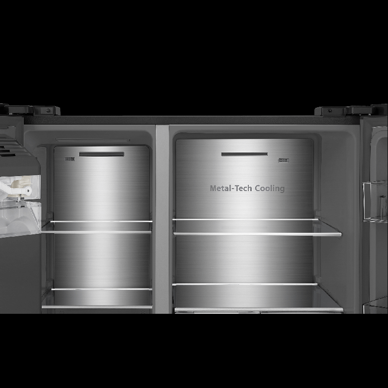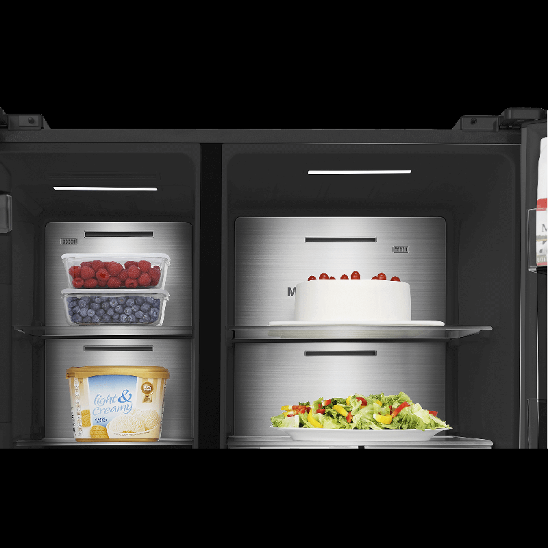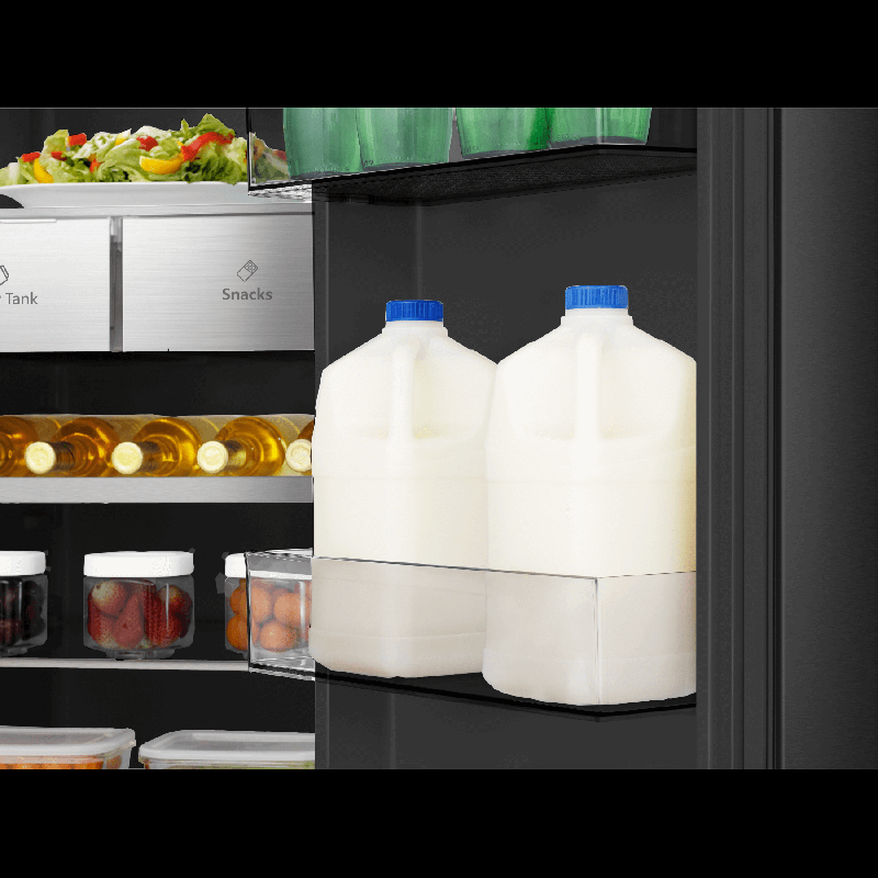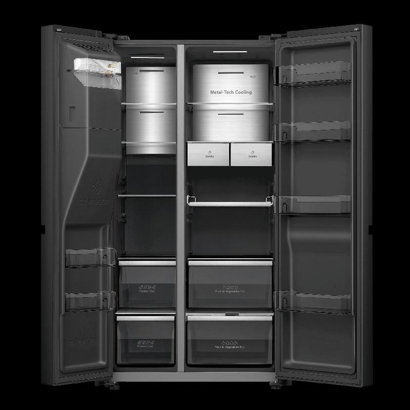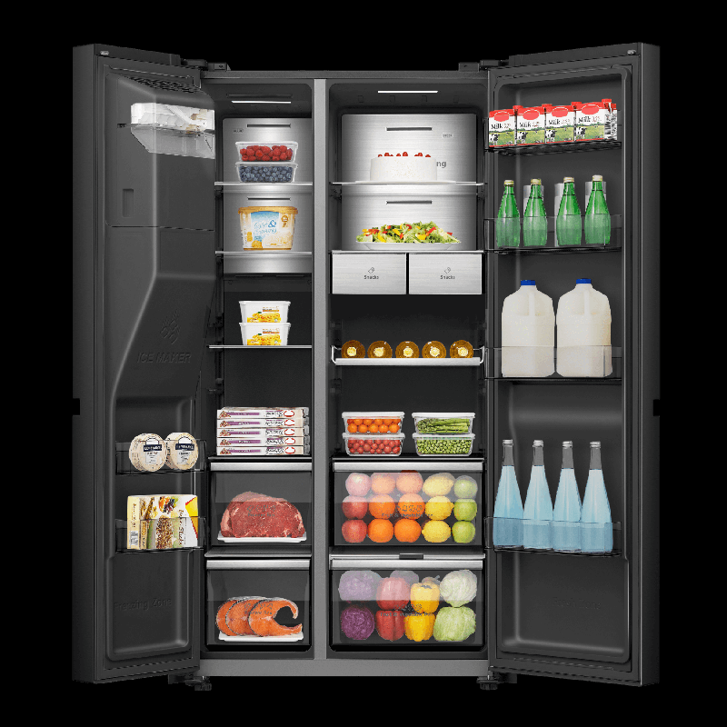 Холодильник Side-by-Side Hisense RS9P628GPFE габаритами 179,5х91х73 см обладает общим объемом 614 л (399 л — холодильная камера, 200 л — морозильная) и обеспечивает хранение большого количества продуктов.