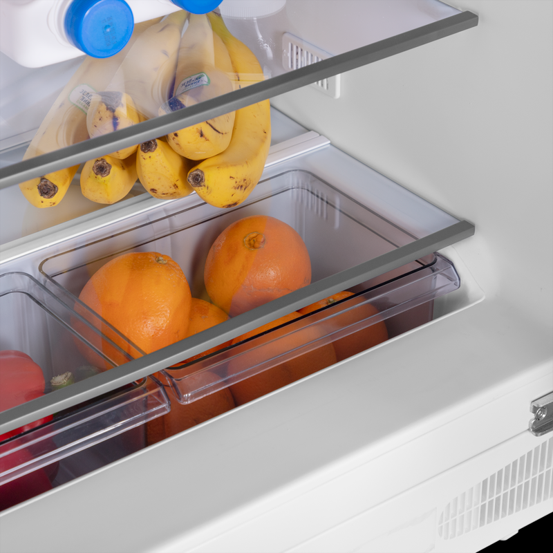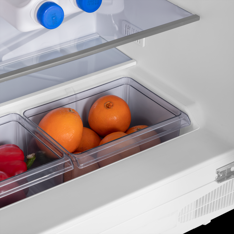 Холодильник предлагает 137 литров общего и 135 литров полезного объема, что оптимально для ежедневного хранения продуктов на одного-двух человек. Внутреннее пространство удобно организовано: есть полки из закаленного стекла, ящик для овощей и фруктов, а также отделения на двери для бутылок и соусов.