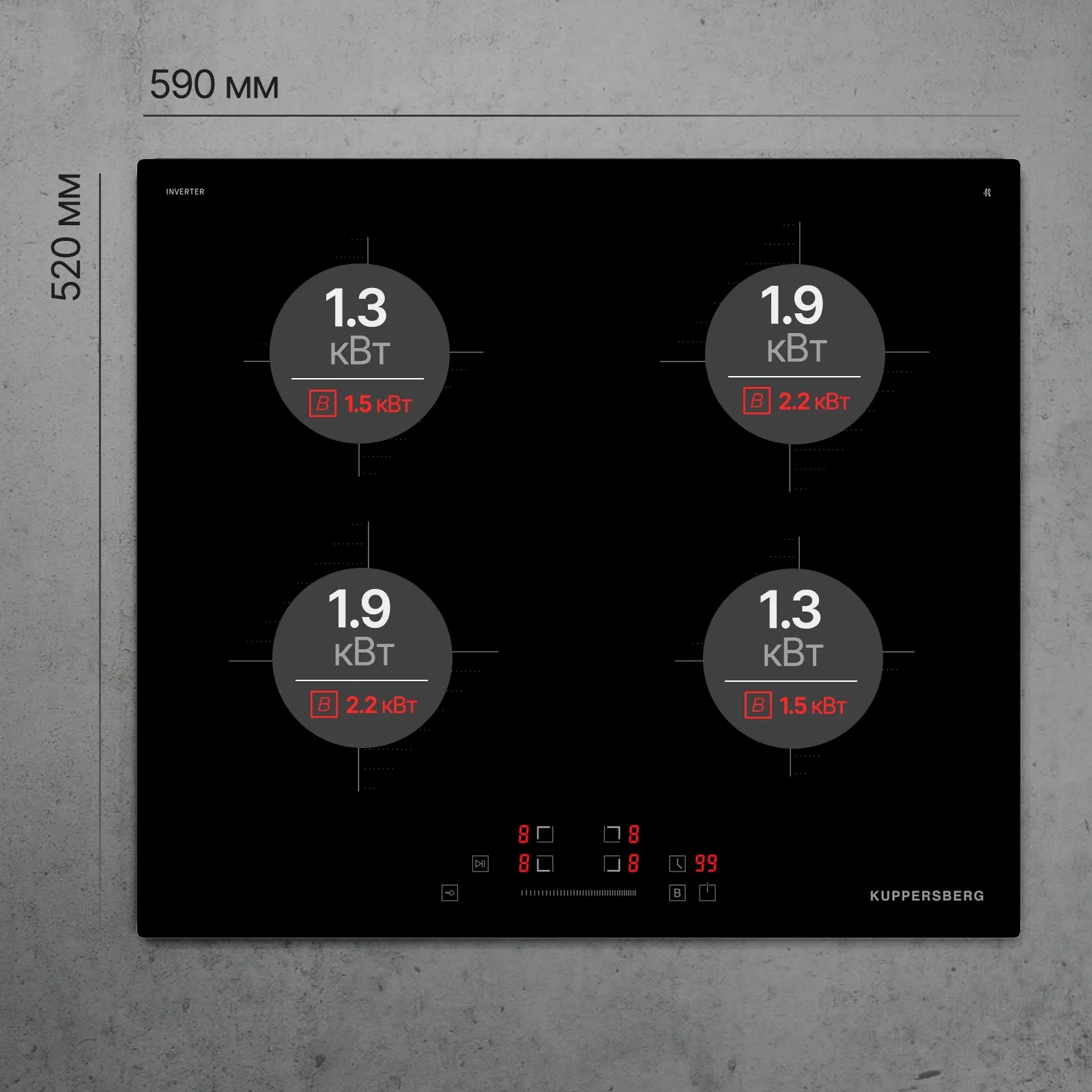 | Мощность (левой ближней конфорки) | 1.9/2.2 кВт |
