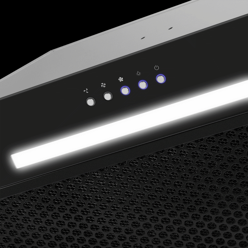 Электронное управление позволяет включить освещение и выбрать одну их 3-х скоростей работы - две стандартные и одна турбо (для быстрой очистки воздуха в экстренных случаях, например, если что-то пригорело). Освещение рабочей поверхности обеспечивается LED-лампой 3,5 Вт .