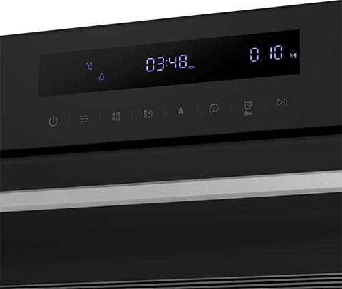 Встраиваемая микроволновая печь. Передняя панель выполнена из стекла. Свет зажигается при открытии дверцы. Настройка программ и таймера осуществляется при помощи сенсорного дисплея.