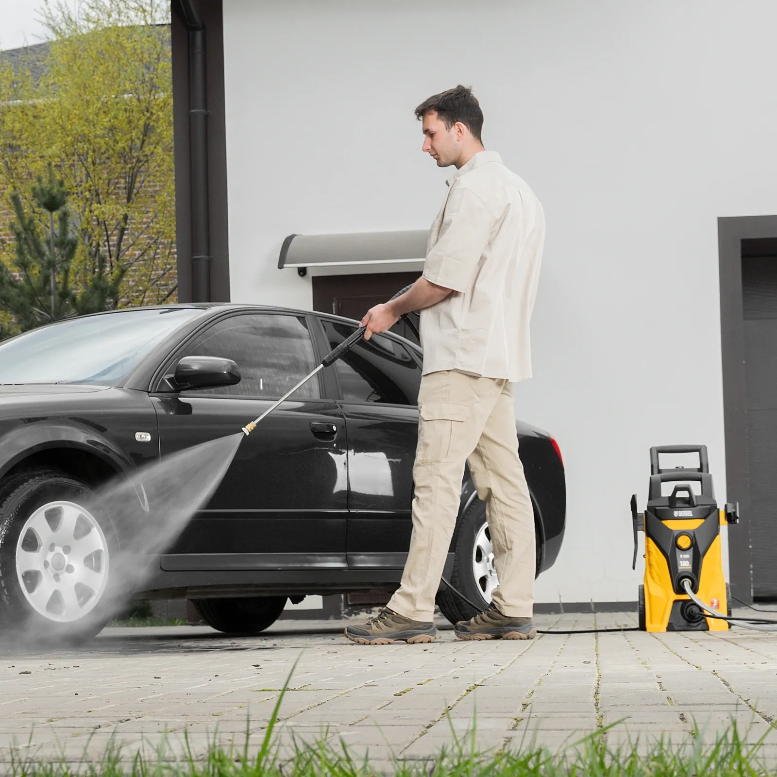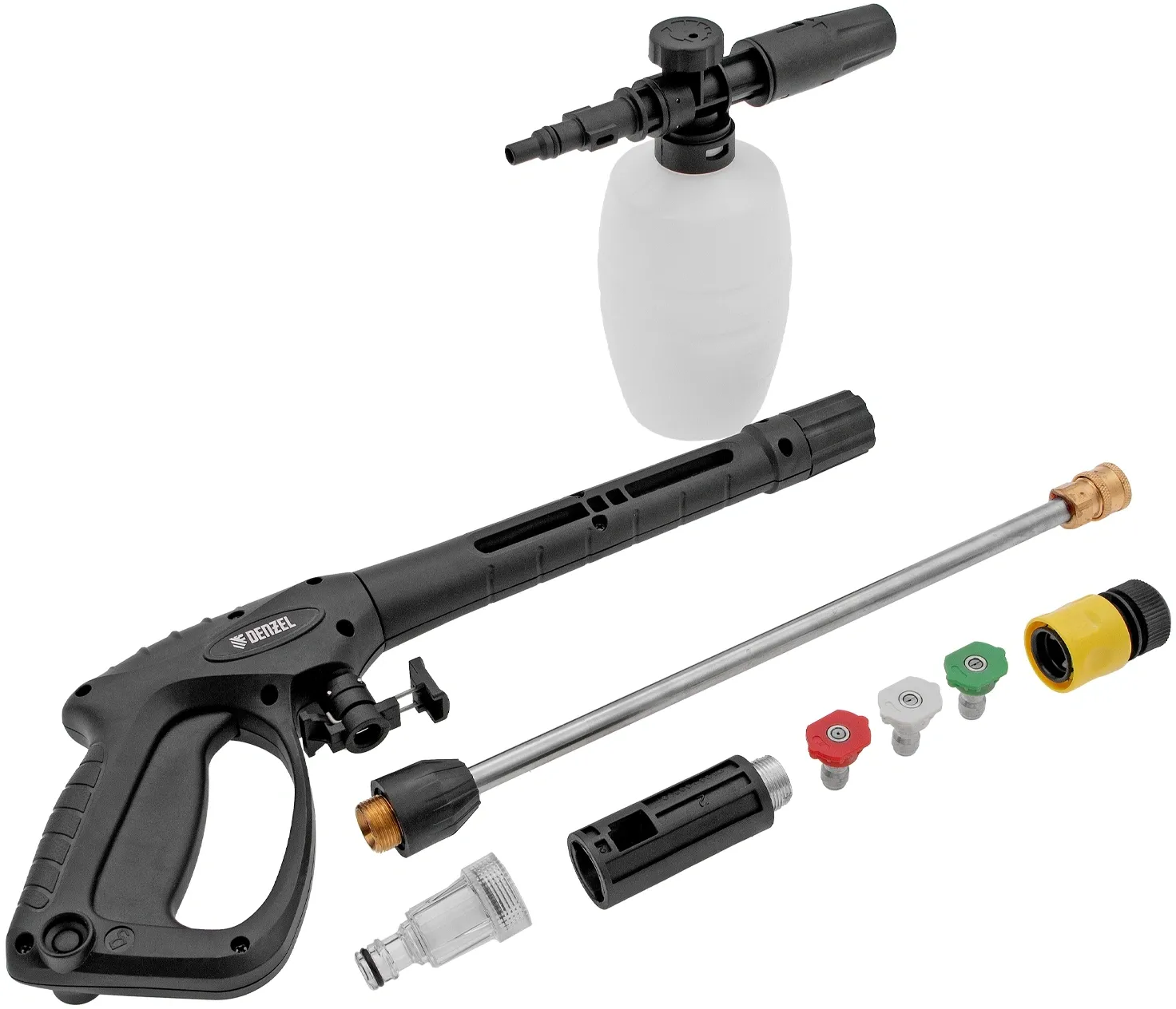 | Комплектация | Мойка, шланг высокого давления, пистолет моечный, стальная насадка-удлинитель, 3 насадки-сопла (0°, 25° и 40°), насадка-пеногенератор, входной штуцер с фильтром, быстросъемный адаптер для входного шла |