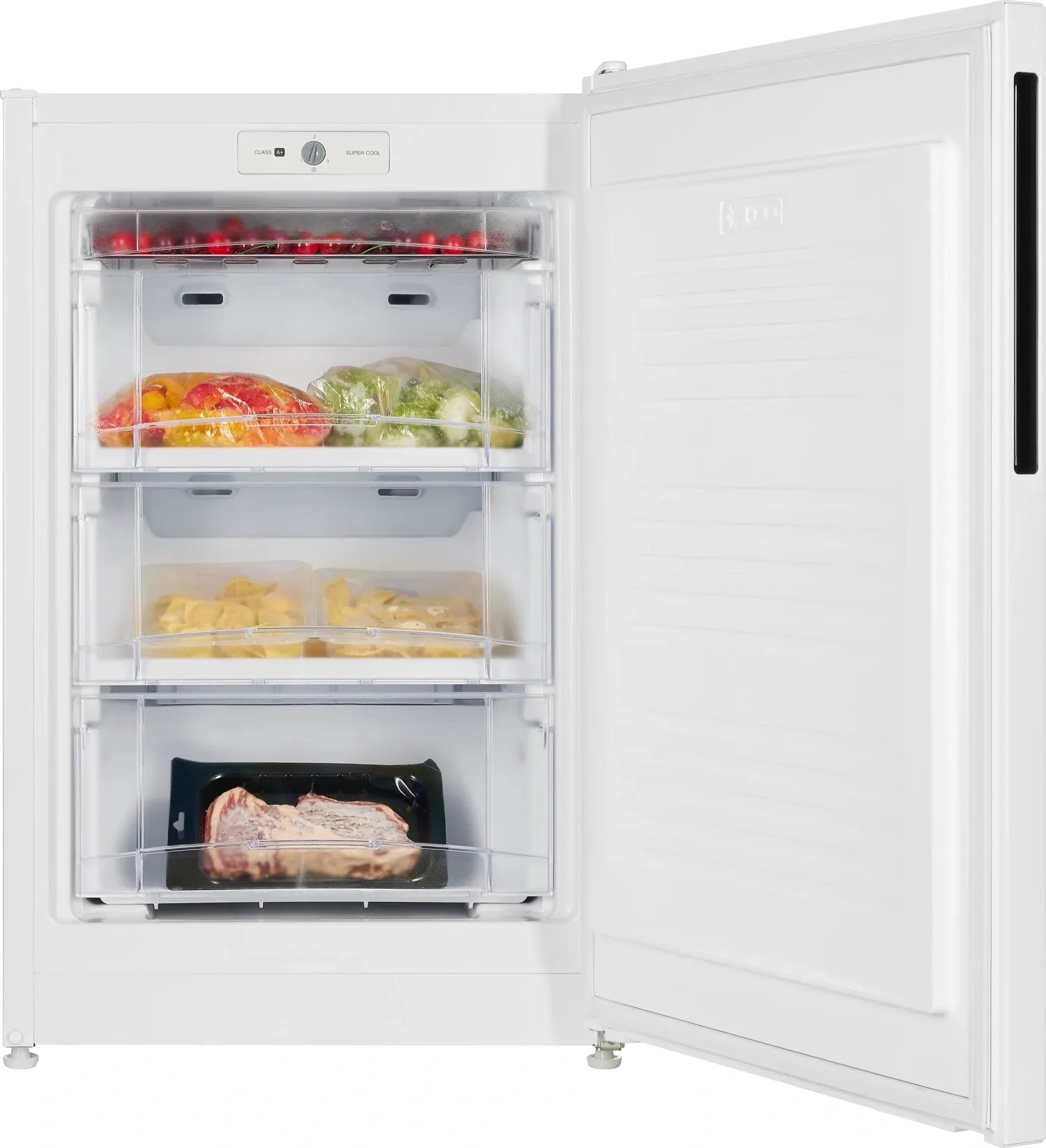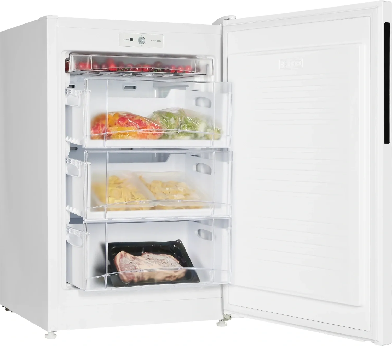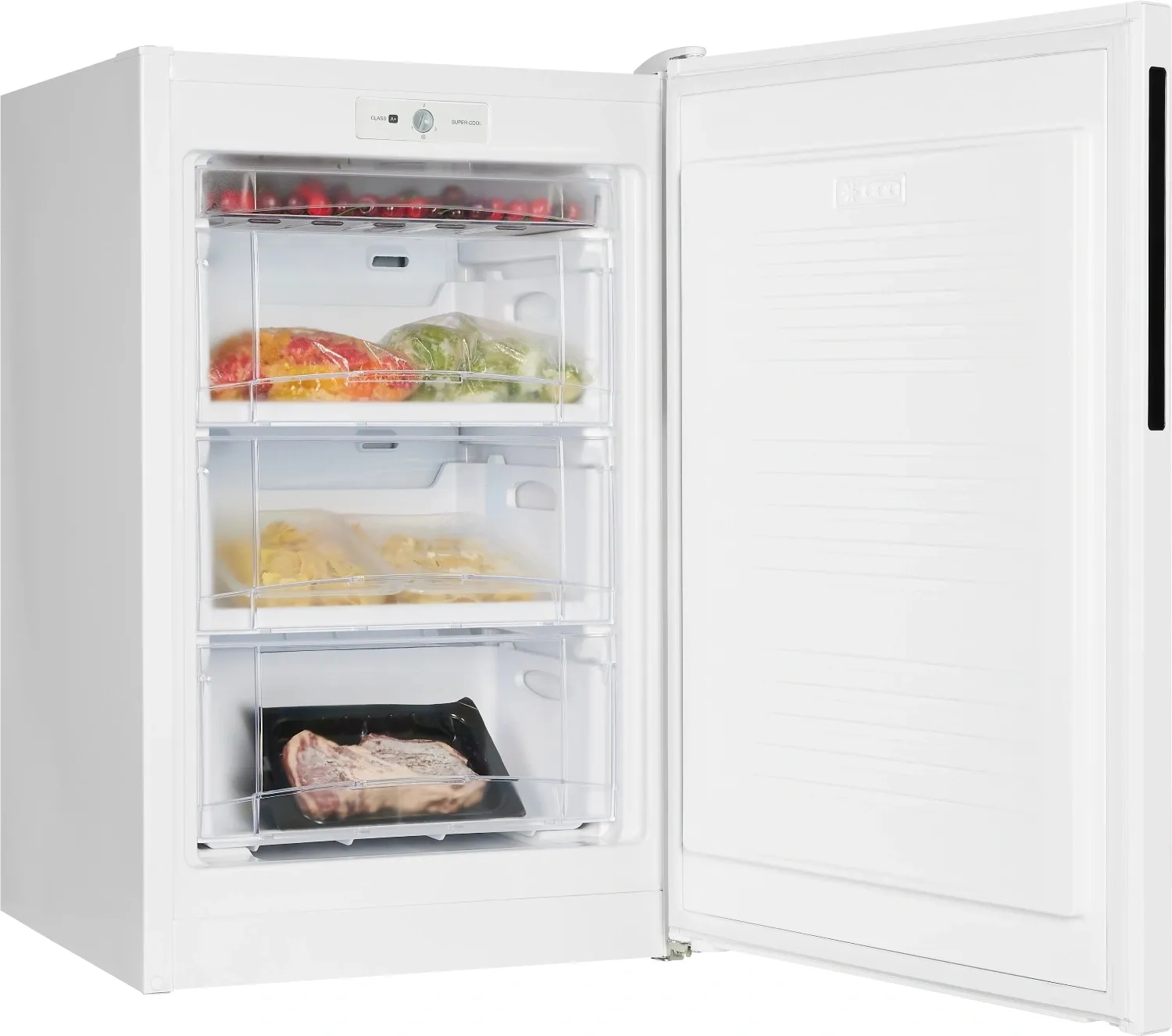 Морозильник белого цвета с интегрированной ручкой и продуманным внутренним пространством станет стильным и технологичным акцентом на вашей кухне. Высота устройства 93 см. Для комфортного открытия и установки морозильника в удобном месте — дверь можно перенавесить с правой стороны на левую.