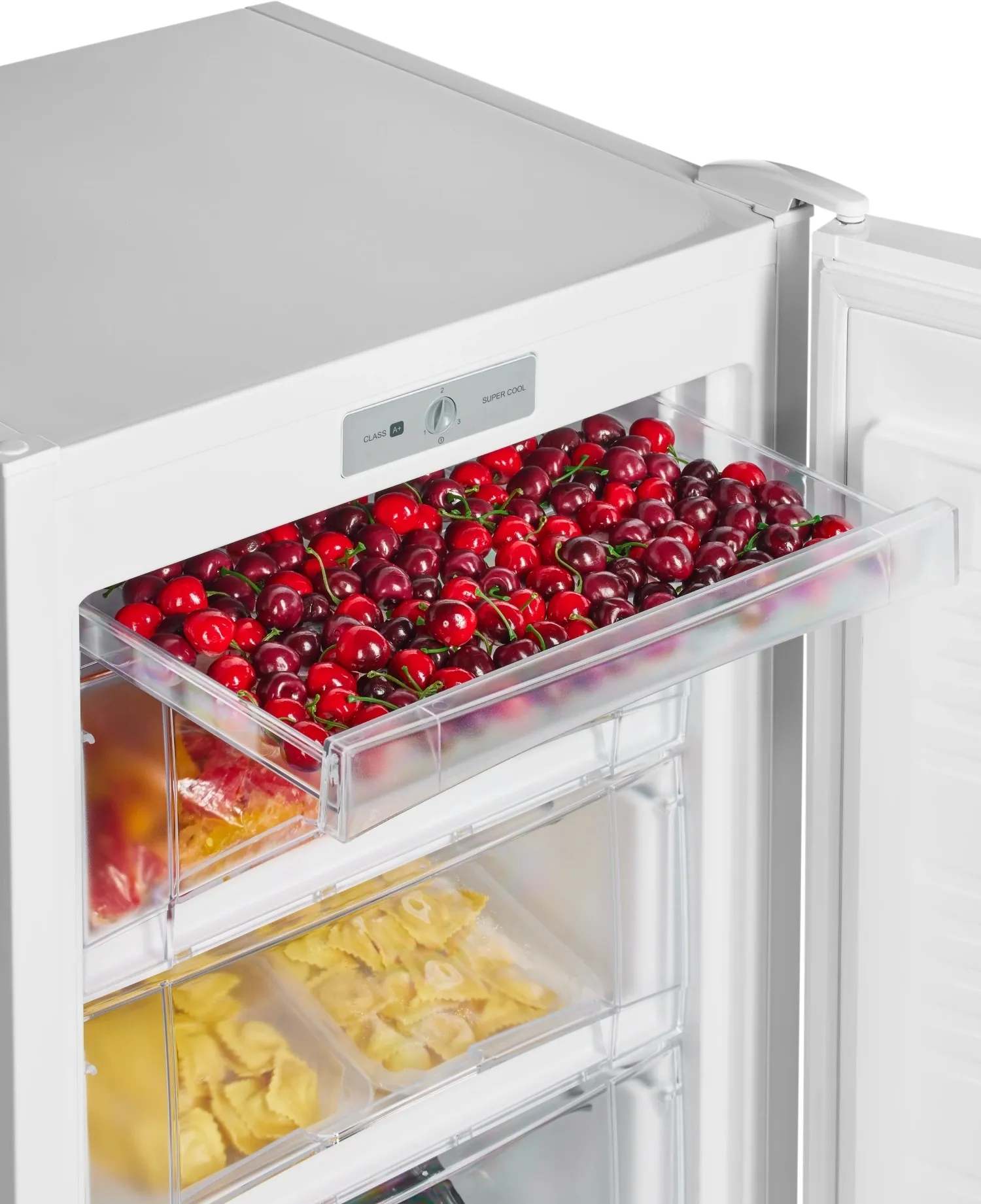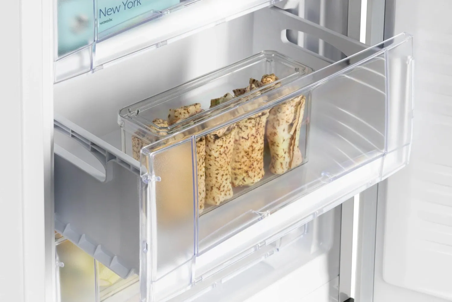 Морозильник имеет 3 выдвижных прозрачных ящика для размещения продуктов, а также лоток для ягод и форму для льда. Внутренняя поверхность модели имеет антибактериальное покрытие, которое предотвращает появление неприятных запахов и образование бактерий.