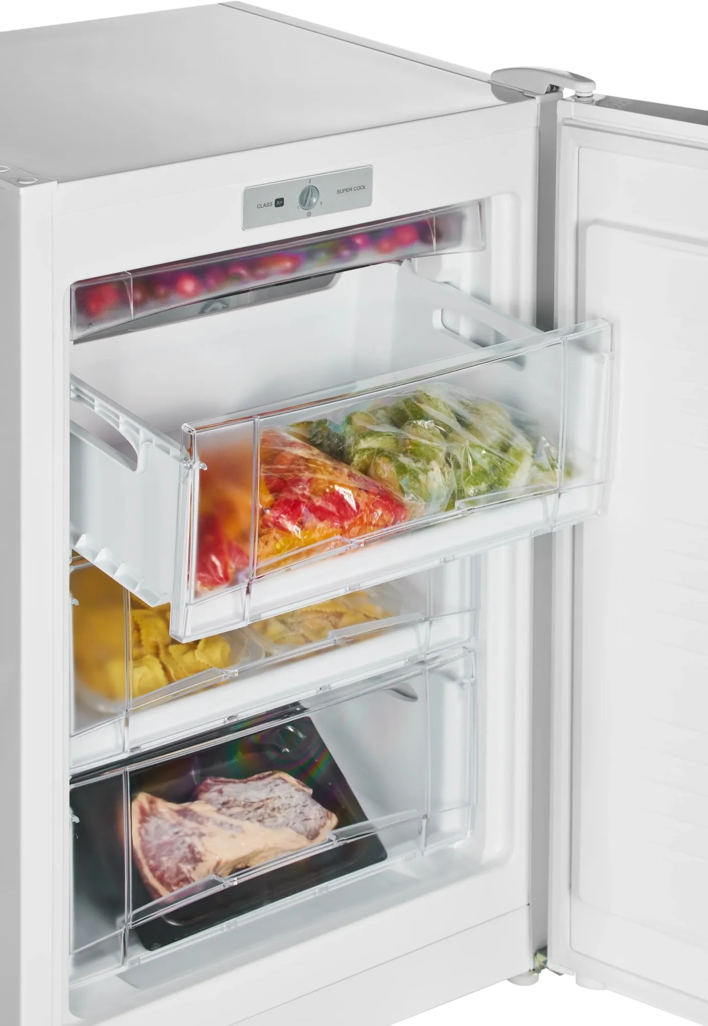Устройство обеспечивает высокую производительность с мощностью замораживания до 8 кг в сутки. В случае отключения электричества, морозильник может автономно сохранять температуру до 10 часов. Панель управления модели расположена внутри камеры. Откорректировать температуру позволит механический термостат с 3 режимами заморозки, где «1» — самая высокая температура, а «3» — максимально низкая -18°С.