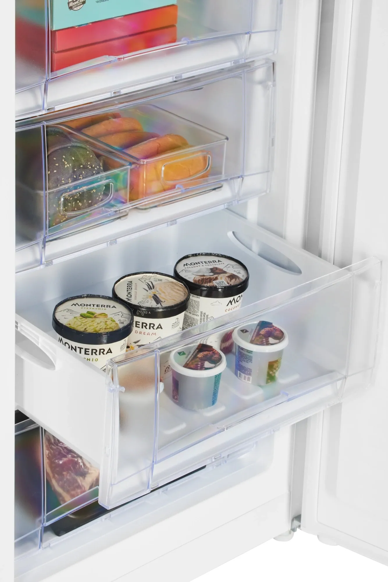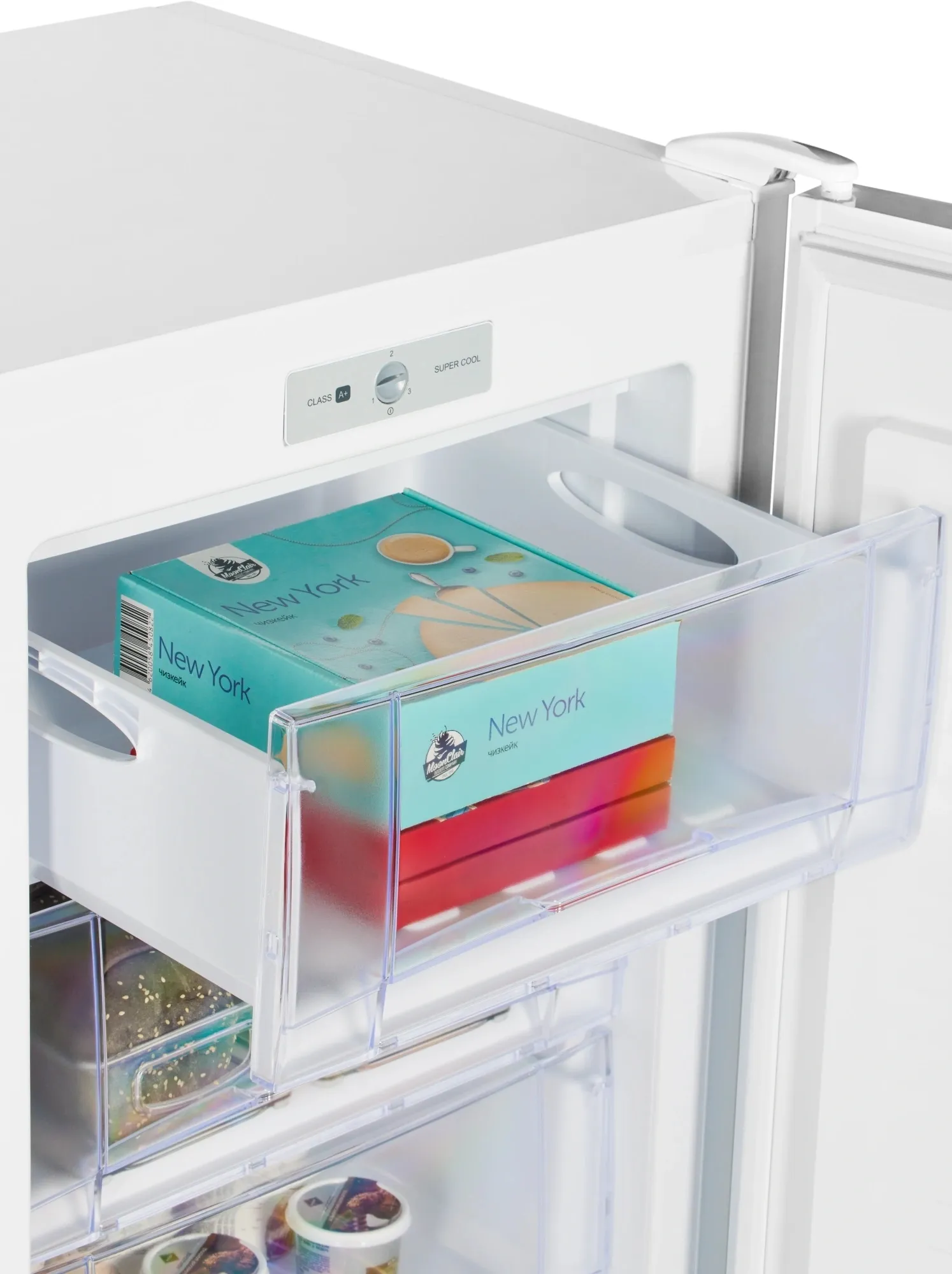 Морозильник имеет 3 выдвижных прозрачных ящика для размещения продуктов, а также форму для льда. Внутренняя поверхность модели имеет антибактериальное покрытие, которое предотвращает появление неприятных запахов и образование бактерий.
