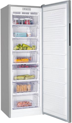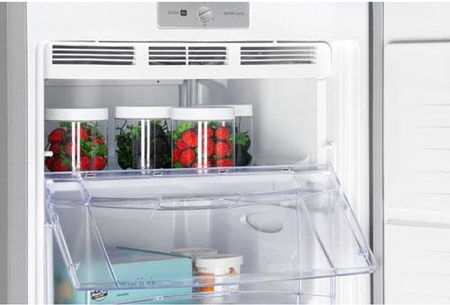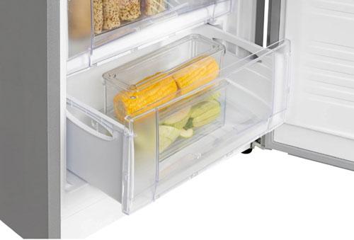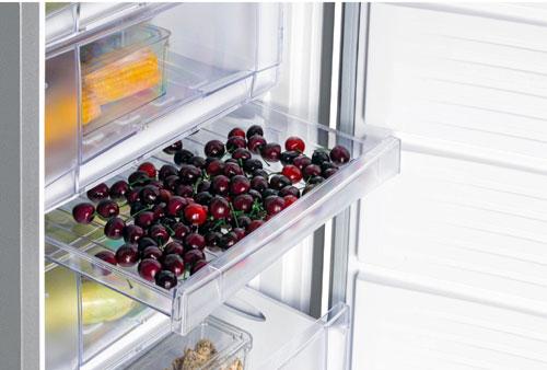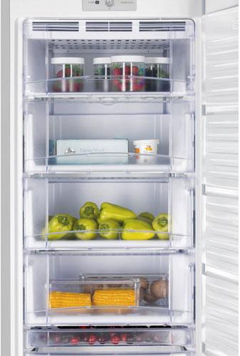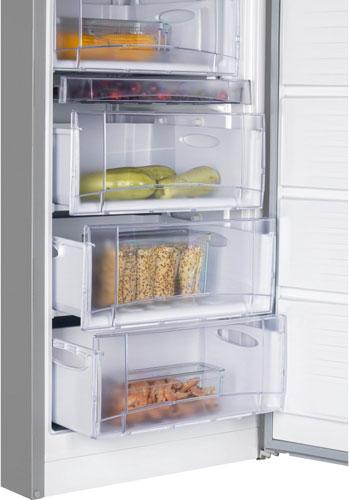 Морозильник имеет 6 выдвижных прозрачных ящиков и 1 отделение с откидной шторкой для размещения продуктов, лоток для ягод и форму для льда. Внутренняя поверхность модели имеет антибактериальное покрытие, которое предотвращает появление неприятных запахов и образование бактерий.