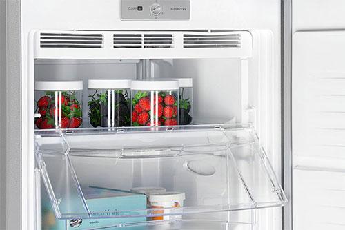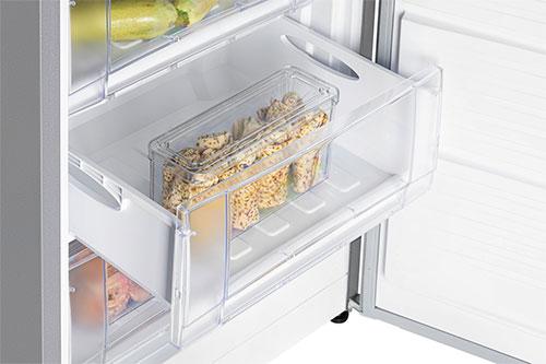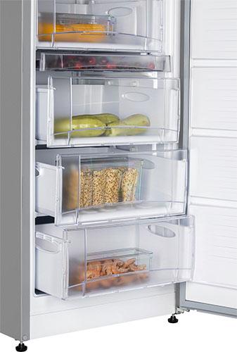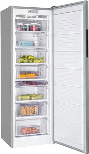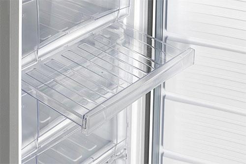 Морозильник имеет 6 выдвижных прозрачных ящиков и 1 отделение с откидной шторкой для размещения продуктов, лоток для ягод и форму для льда. Внутренняя поверхность модели имеет антибактериальное покрытие, которое предотвращает появление неприятных запахов и образование бактерий.