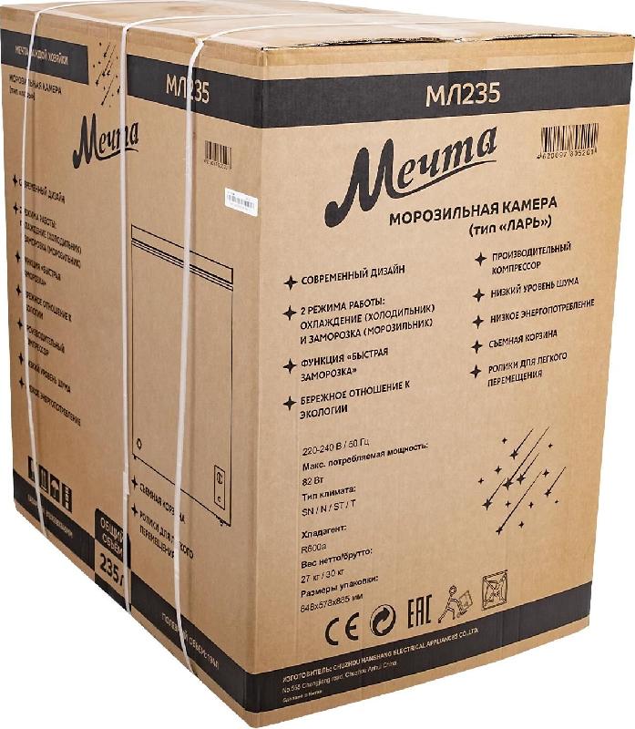 Объем общий/полезный 235л/194л, производительность по заморозке 12кг/24ч, энергоэффективность А+, энергопотребление 199кВтч/год, номинальная мощность 82Вт, климатический класс SN/N/ST/T, режимы холодильник/морозильник, быстрая заморозка, хладагент R600a, уровень шума 42дБ, температура в камере 0...0+8 °С/ -18...-24 °С, разморозка ручная, вес нетто/вес брутто 27кг/30кг, габариты (ШхГхВ) 818х558х845мм, упаковка (ШхГхВ) 848х578х885мм
